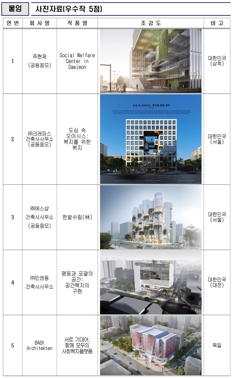 최종 선정된 우수작은 ▲주현제·이종진 건축사 ▲(주)크레파스 건축사사무소 ▲(주)에스샵 건축사사무소 ▲(주)민앤동 건축사사무소 ▲BAEK Architekten 등 5개 팀이다.