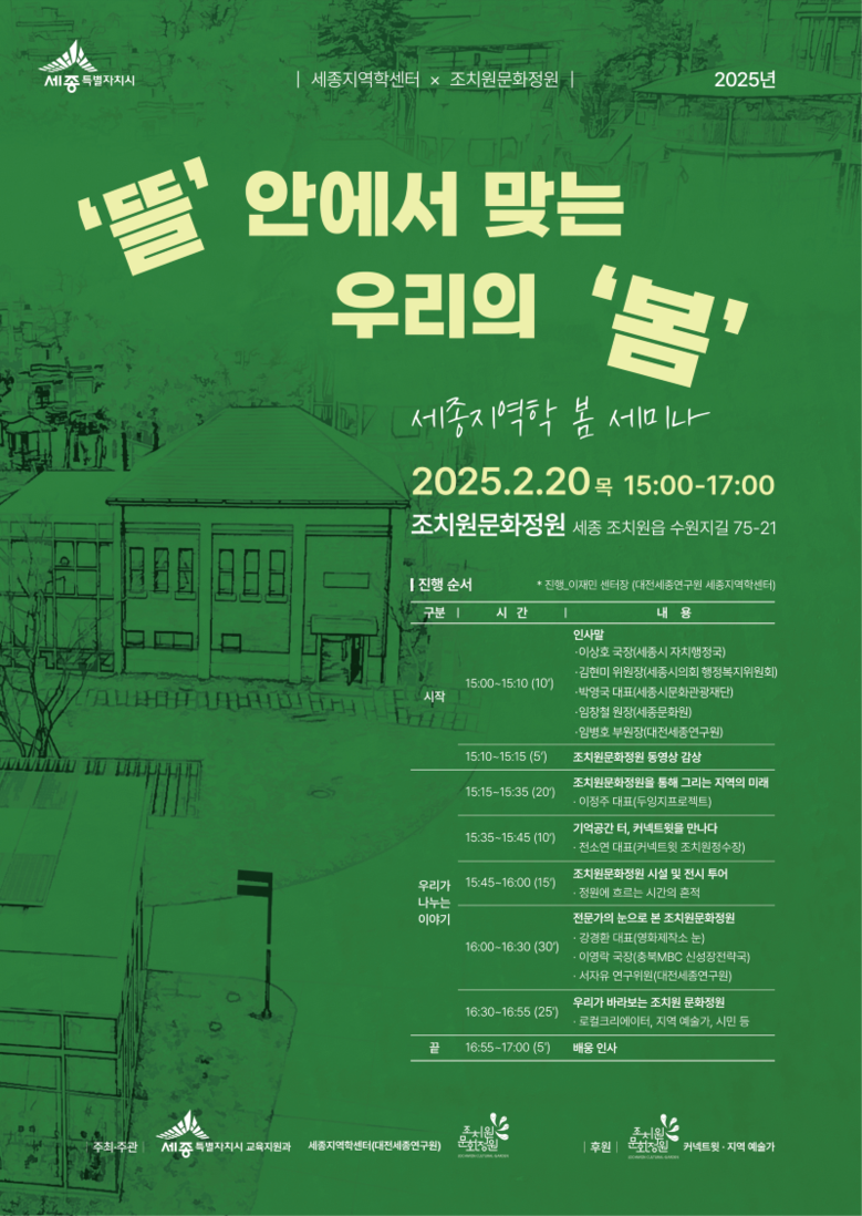 또 조치원 문화정원 내 전시공간 ‘샘’에서 전시 중인 ‘정원에 흐르는 시간의 흔적’을 시민들과 함께 관람하며 문화정원의 과거와 현재를 만나볼 수 있는 시간도 진행될 예정이다.