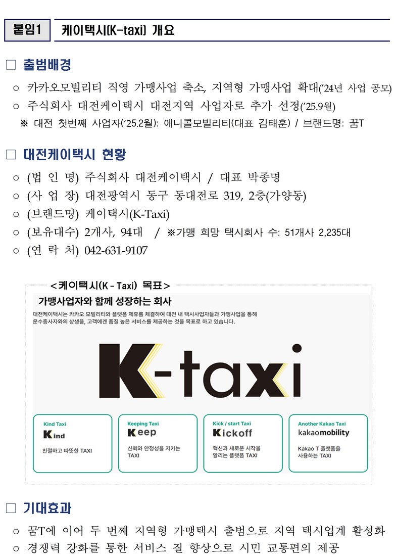 대전케이택시의 브랜드 ‘케이택시(K-Taxi)’는 올해 3월 출범한 대전지역 1호 가맹택시‘꿈T’에 이어 두 번째로 면허를 받은 가맹택시다. Kind Taxi(친절하고 따뜻한 택시), Keeping Taxi(신뢰와 안정성을 지키는 택시), Kick/start Taxi(혁신과 새로운 시작을 알리는 플랫폼 택시), Another Kako Taxi(카카오T 플랫폼을 사용하는 택시)를 목표로 하고 있다.