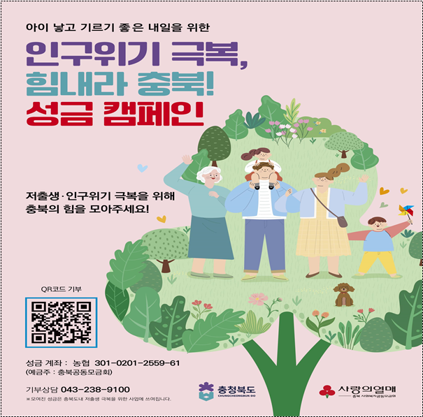 한편, 지난해 6월부터 충북도와 충북사회복지공동모금회가 함께 추진하고 있는 저출생·인구위기 극복 성금 모금 캠페인은 계좌이체, QR코드 등을 통해 소액이라도 누구나 참여할 수 있다.