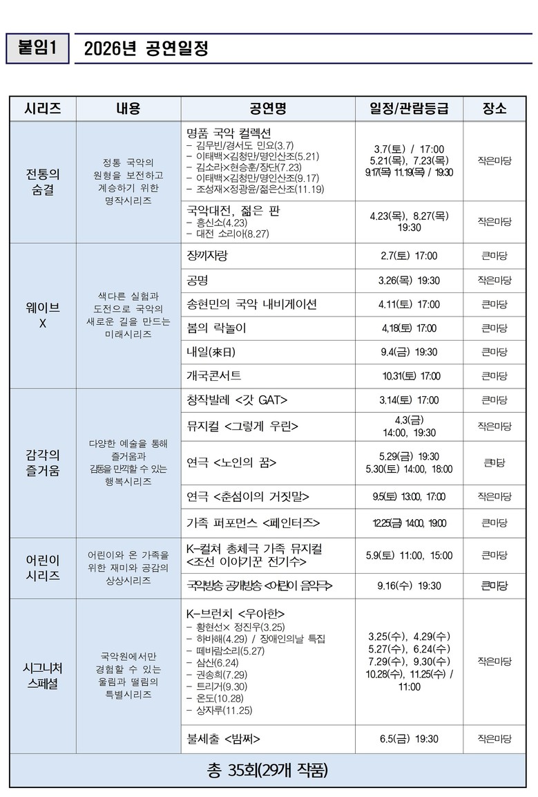 오병준 원장은 “국악원의 2026년 시즌공연은 국악원이 나아갈 방향성을 보여주는 좌표이자 국악원이 시민들에게 다가가고자 하는 뜨거운 마음”이라면서 “정통 국악은 물론 현대적 국악과 뮤지컬, 연극, 발레 등 공연 하나 하나를 엄선해서 준비했으니 시민들이 국악원에서 새로운 국악을 경험하고 특별한 행복을 충전하길 바란다”라고 말했다.