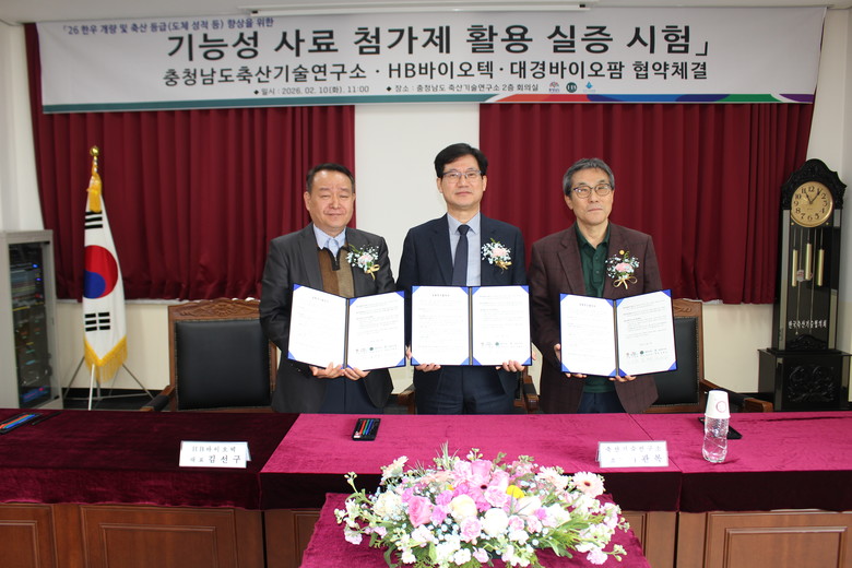 도 축산기술연구소는 지난 10일 연구소에서 이관복 축산기술연구소장과 김선구 HB바이오텍 대표, 김현섭 대경바이오팜 대표가 ‘한우 기능성 사료 첨가제 활용 실증시험 공동연구협약(MOU)’을 체결했다고 11일 밝혔다.