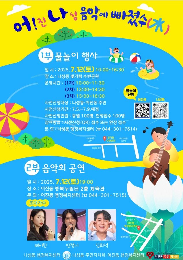 이날 오전 10시부터 오후 4시 30분까지는 나성동 빛가람수변공원에서 워터슬라이드와 야외 수영장이 운영되며, 신발 던지기 게임 등 다양한 물놀이 축제가 진행된다.
