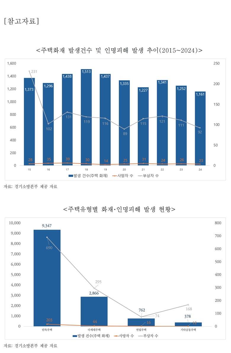 주택 화재는 높은 치명률이라는 뚜렷한 특징을 보인다. 최근 10년간(2015~2024) 경기도 주택 화재 발생 건수는 1만 3,373건이며, 이로 인한 사망자는 275명이다. 치명률로 환산하면 2.05%로, 같은 기간 전체 화재 평균 사망률인 0.8%의 약 2.6배 수준이다. 비주택 화재 사망률(약 0.6%)과 비교하면 3배가 넘는다. 전체 주택 화재와 인명피해의 약 90%가 단독・다세대주택에서 발생했다.