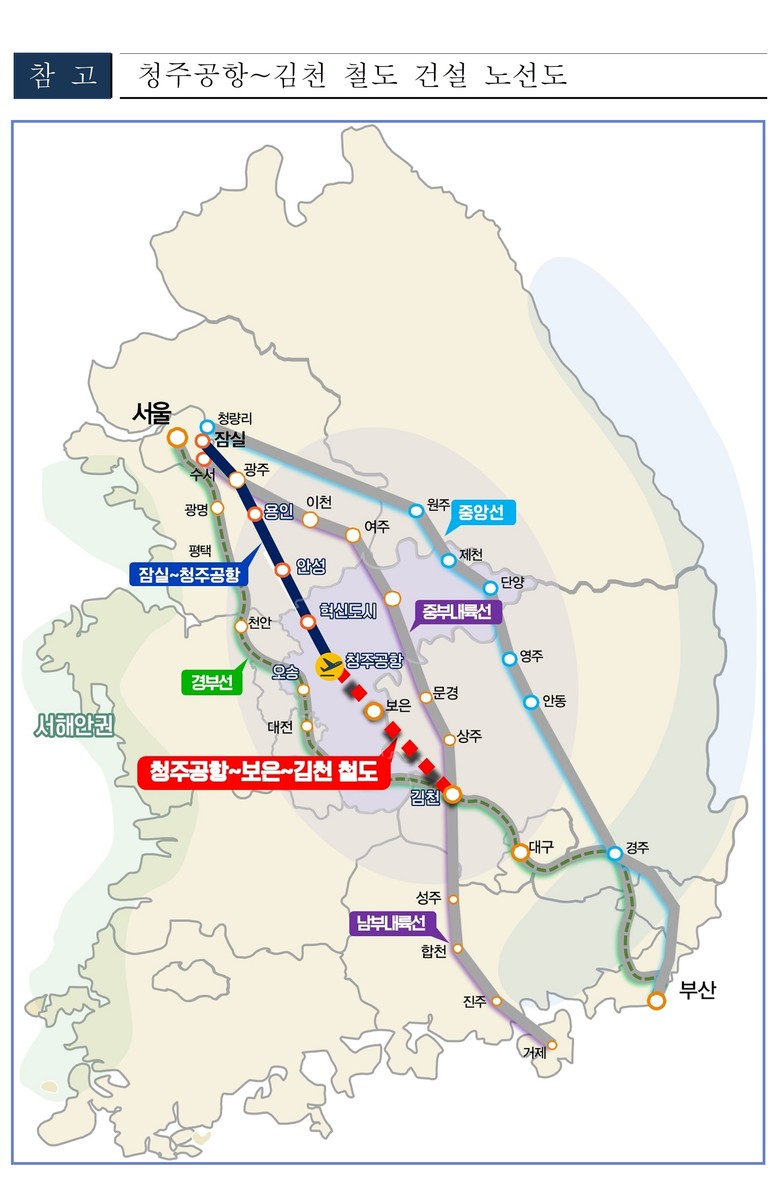 ‘청주공항~보은~김천’ 철도 노선은 대한민국 중부와 남부를 연결하는 직결 노선으로 약 3조 원의 사업비를 투입하여 96.1km의 단선 철도를 신설하는 사업이다. 해당 노선이 국가철도망구축계획에 반영되면 현재 추진되고 있는 잠실~청주공항 광역철도 및 남부내륙선(김천~거제)과 직결돼 서울 강남에서 시작해 수도권과 남해안을 최단거리로 연결하는 국가의 새로운 종단축이 완성된다.