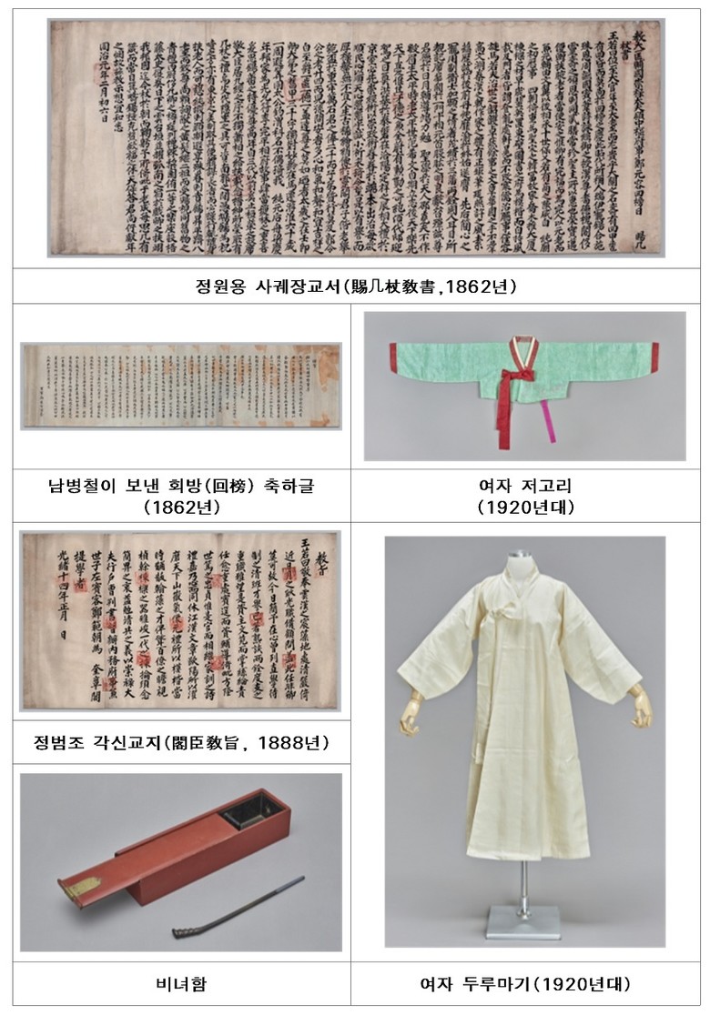 주요 유물로는 △가문 구성원들이 관직에 임명되고 활동한 사실을 보여주는 교지·간찰 등 고문서류 △제례와 의례 문화를 담은 제문·의례 기록 △회동정씨의 대표 인물인 정원용의 초상화 일습 △당시 생활상을 보여주는 옻칠함, 의복 등의 생활용품이 있다.