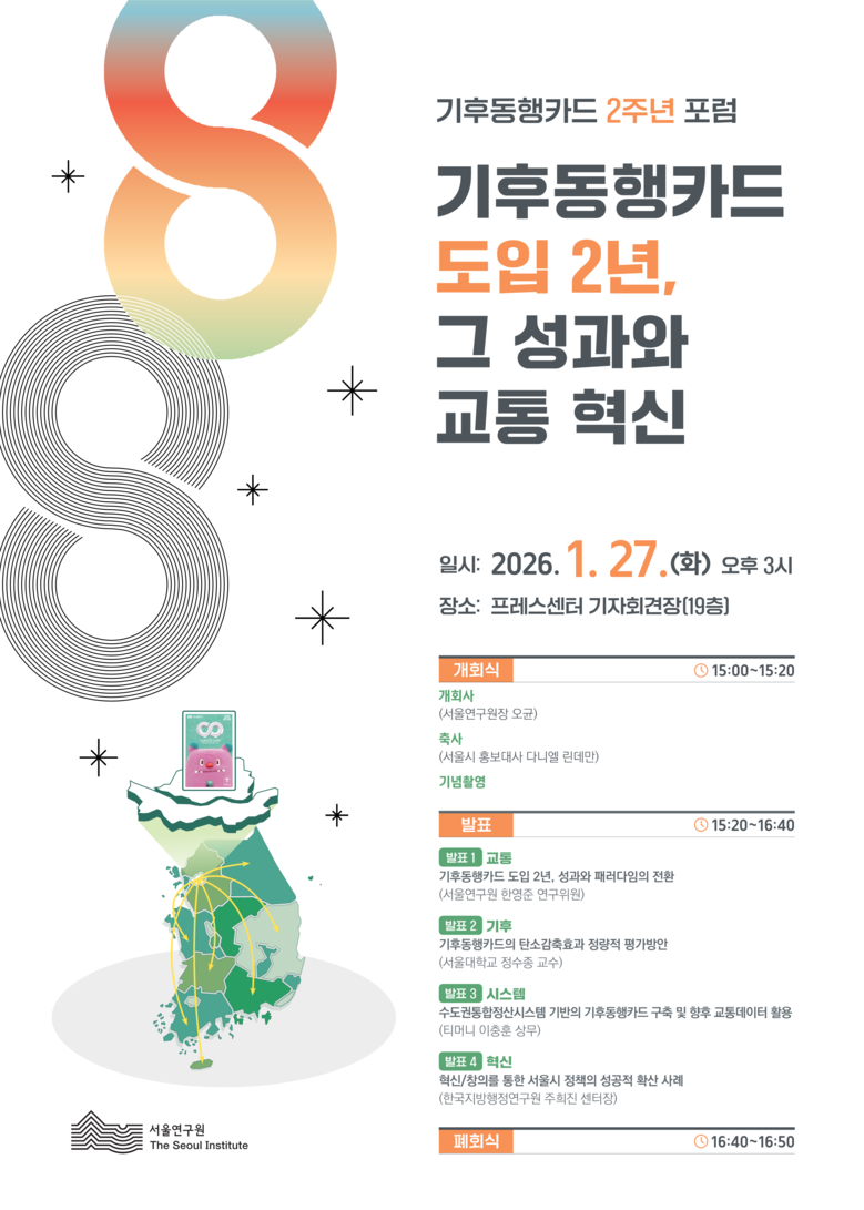 두 번째 발표는 정수종 서울대학교 교수가 ‘기후동행카드의 탄소감축효과 정량적 평가방안’을 주제로 발표한다. 전 지구적 기후 위기 대응이라는 관점에서 기후동행카드의 정책적 의미를 조명하고, 해외 주요 도시의 기후·교통 정책 사례를 통해 서울형 기후 교통정책이 갖는 시사점과 확산 가능성을 제안할 예정이다.