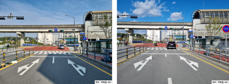 | ▲ 횡단보도와 차량정지선 이격거리를 5m로 확대한 처인구 역북동 491번지의 모습. 사진은 이격거리 확대 전(좌)과 후(우) |