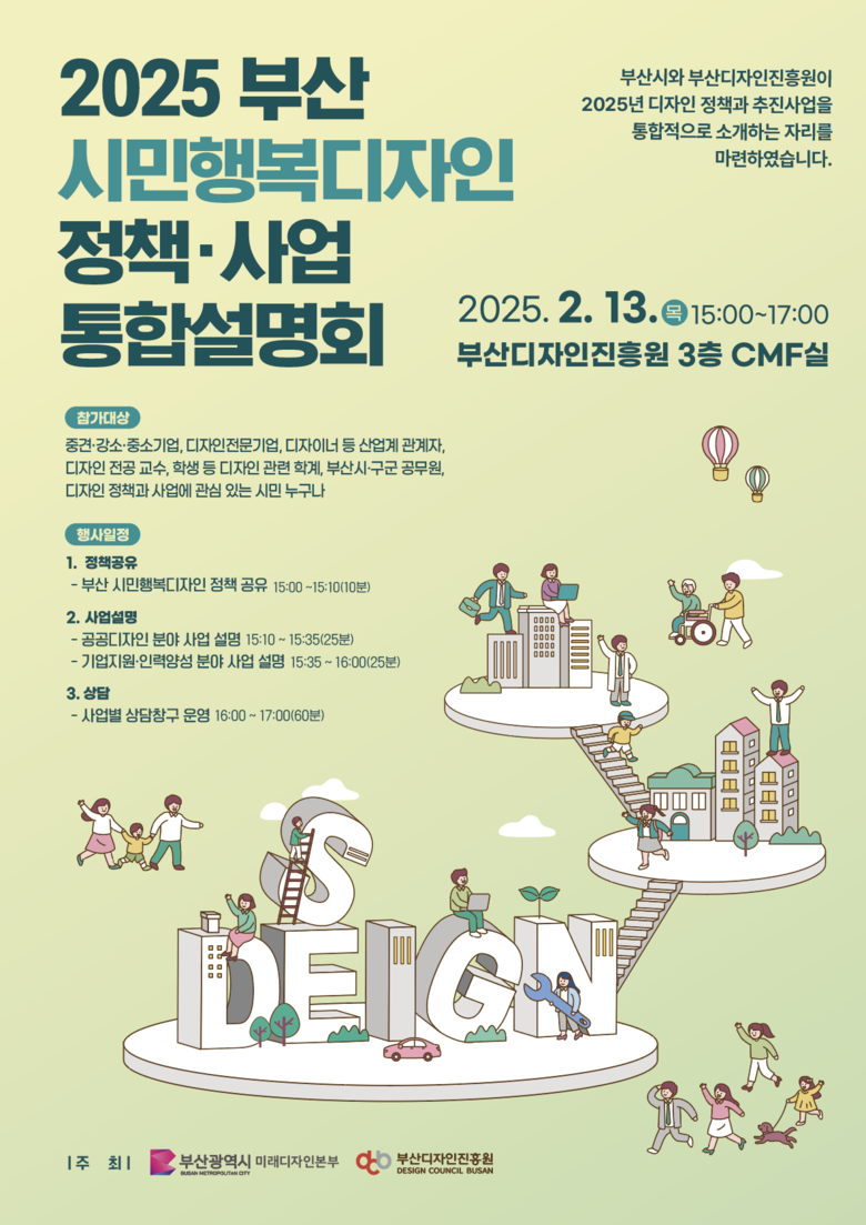 이날 통합설명회는 ▲올해(2025년) 부산 시민행복디자인 정책 공유를 시작으로 ▲분야별 추진사업 현황 등 발표 ▲사업 참여 방법 안내 등이 진행될 예정이다.