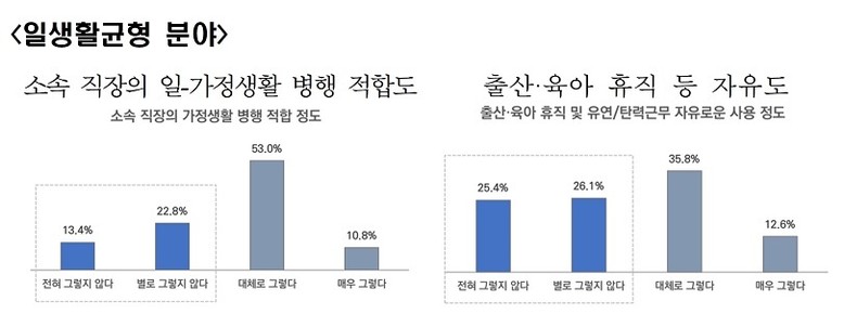 또한 소속 직장에서의 일‧가정 병행의 적합 정도가 63%정도로 높았음에도 경북에 가장 필요한 출산 정책으로 출산‧육아휴직 확대가 꼽힌 것은 제도가 현장에서 체감되기 어렵다는 점을 시사하는 것으로 해석된다.