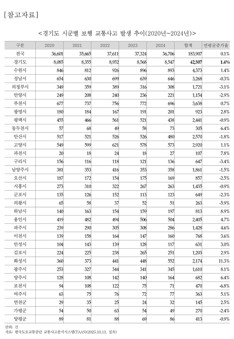 이번 연구는 고령사회로의 변화, 갑작스러운 폭우나 폭설 같은 기후 변화가 잦아지는 상황에서 ‘걷기 안전한 경기도’를 만들기 위해 시작했다. 특히 집 앞의 좁은 길인 ‘생활도로’는 차와 사람이 섞여 사고 위험이 크지만, 그동안 안전관리의 사각지대로 남아 있었다는 점에 주목했다. 실제로 최근 5년간 경기도 보행자 교통사고는 총 42,507건으로 전국 평균보다 높은 증가세를 보였다.