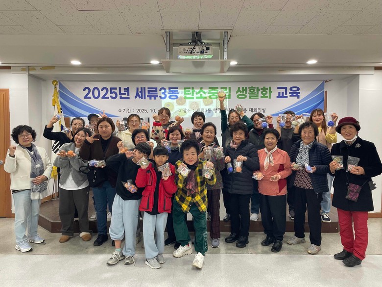 | ▲ 세류3동 주민들이 주민자치를 위한 탄소중립 생활화 교육에 참여한 뒤 기념촬영을 하고 있다. |