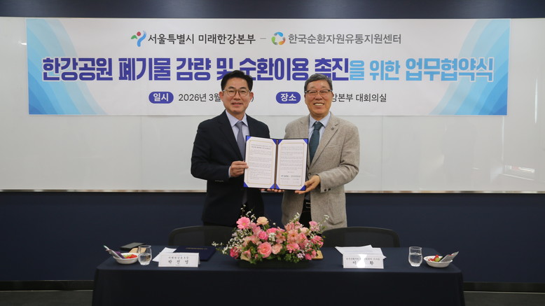 [서울 세계타임즈=이장성 기자] 서울시 미래한강본부가 12일(목) 한강공원 내 폐기물 감량 및 순환이용 촉진을 위해 폐기물 재활용 분야 전문기관인 한국순환자원유통지원센터(KOrea Resource circulation service Agency, 이하 KORA)와 업무협약을 체결했다.