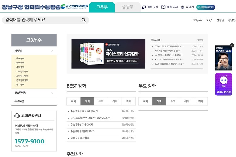 ‘강남인강’에서는 중등부 내신 강의부터 고등부 수능 준비까지 단계별, 수준별 인터넷 강의를 지원하고 있으며, 유명 현직 교사와 EBS 수능 스타강사 등 실력파 강사들이 직접 강의를 진행한다.