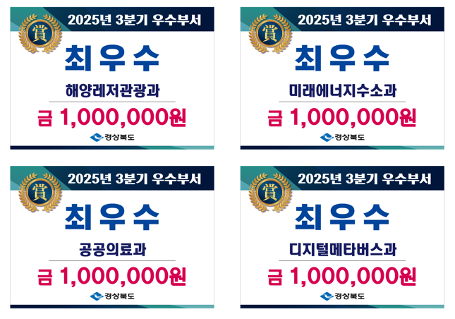 - 국정과제·국제행사 대응하며 경북형 전략사업 현실화 - [경북 세계타임즈=한윤석 기자] 경상북도는 27일 올해 3분기 동안 탁월한 성과를 창출한 디지털, 의료, 에너지, 해양레저관광 등 4개 분야의 우수부서를 선정하고, 시상했다.