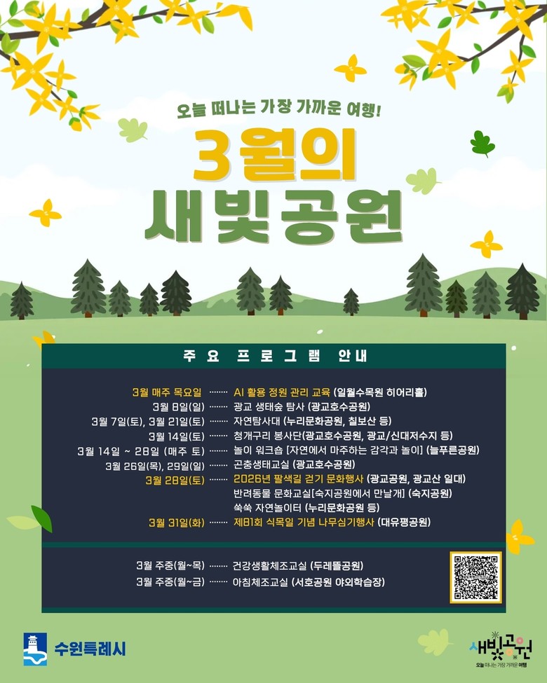 수원시 관계자는 “3월에는 시민이 직접 걷고 나무를 심으며 봄을 체감할 수 있는 다양한 행사가 열린다”며 “공원 곳곳에서 운영되는 다양한 프로그램에 많은 시민이 참여하길 바란다”고 말했다.
