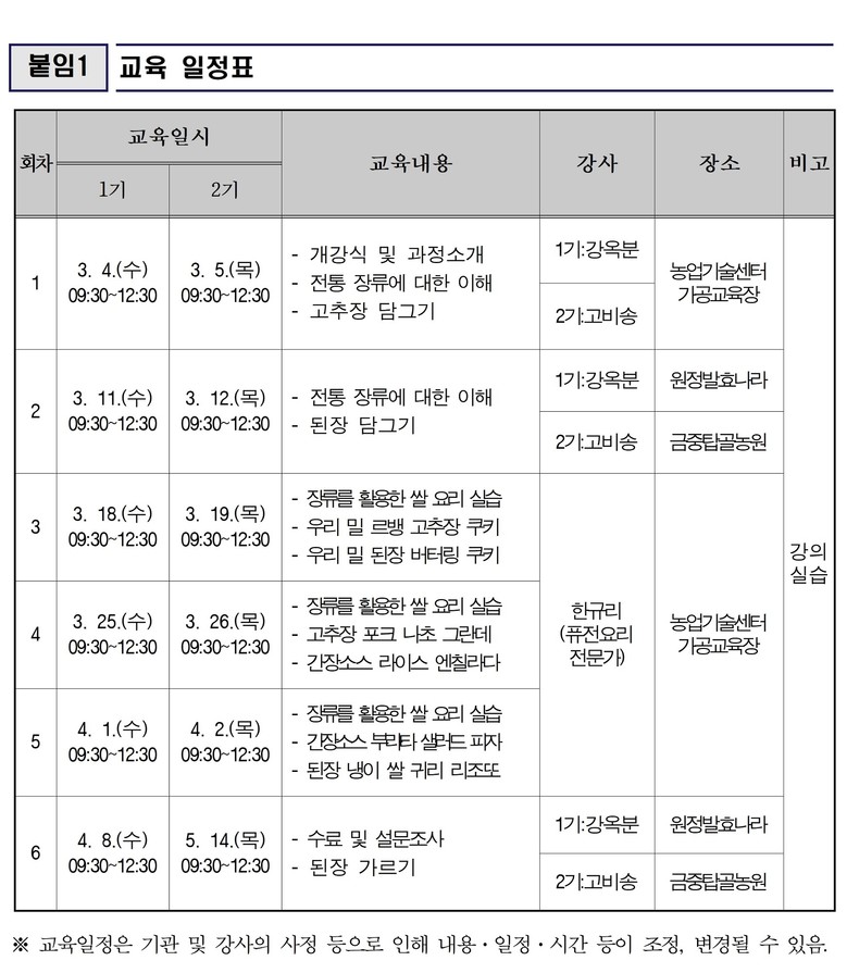 주요 교육 내용은 ▲전통 고추장 담그기 ▲된장 담그기 ▲장류를 활용한 우리 쌀 요리 실습 등으로, 우리 밀 된장 버터링 쿠키, 간장소스 라이스 엔칠라다, 된장 냉이 쌀 귀리 리조또 등 전통과 현대 및 세계 요리를 접목한 메뉴가 포함된다. 담근 된장은 숙성 후 교육생이 직접 가져갈 수 있도록 운영된다.