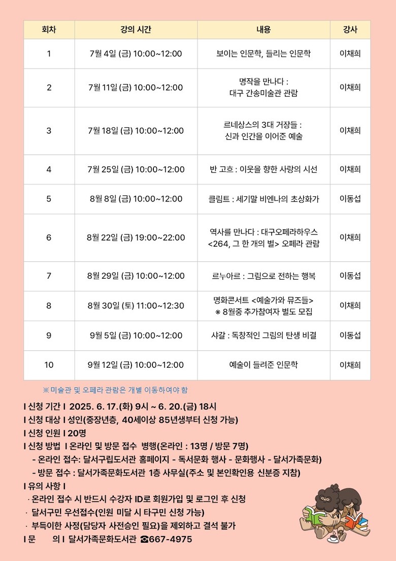 올해 달서가족문화도서관은 “보이는 인문학, 들리는 인문학”을 주제로, 명화와 명곡을 인문학적 관점에서 해석하는 강연 프로그램을 운영한다.