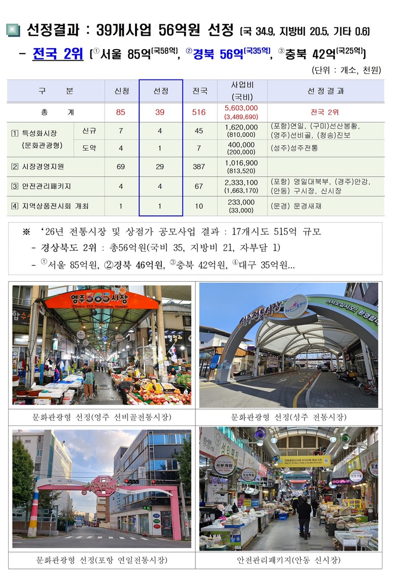 - 빈점포활성화, 기반시설조성, 특화시장육성, 안전한 전통시장 만들기 사업 등 추진 - [경북 세계타임즈=한윤석 기자] 경상북도가 중소벤처기업부의 ‘2026년 전통시장 및 상점가 활성화 공모사업’인 문화관광형시장, 시장경영지원, 안전관리패키지, 지역상품전시회 사업에서, 39개 시장 총 56억원(국비 35억원)을 확보하는 성과를 거두었다.