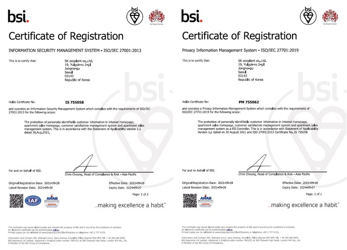 [세계타임즈 이진화 기자]SK에코플랜트가 건설업계 최초로 국제표준화기구(이하 ISO)에서 제정한 국제표준 정보보호 ‘ISO 27001’ 인증과 개인정보보호 ‘ISO 27701’ 인증을 동시에 취득했다고 11일 밝혔다.
