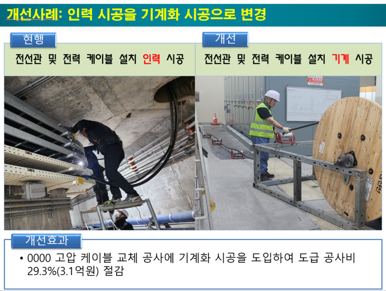○ ‘나’ 케이블 교체공사에서 인력으로 케이블을 교체하려는 것을 기계 시공으로 개선해 작업의 효율성을 높였을 뿐만 아니라 노무비를 줄여 도급공사비의 29.3퍼센트(%)(3.1억 원)를 절감했다.