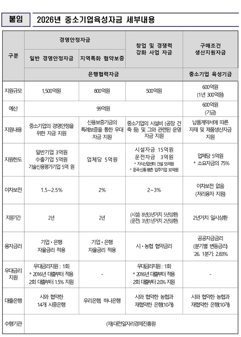 대전시는 올해부터 변화하는 경영 환경에 맞춰 우대금리 지원 대상을 대폭 확대했다. 기존 대상에 더해 ▲평촌산단 입주기업 ▲일자리 으뜸기업 ▲양육친화기업 ▲재해중소기업 ▲대전투자금융(주) 출.투자기업 ▲대전시 실증-기보 사업 참여기업 등이 새롭게 포함되어 지역 기업들의 자생력 강화를 돕는다.