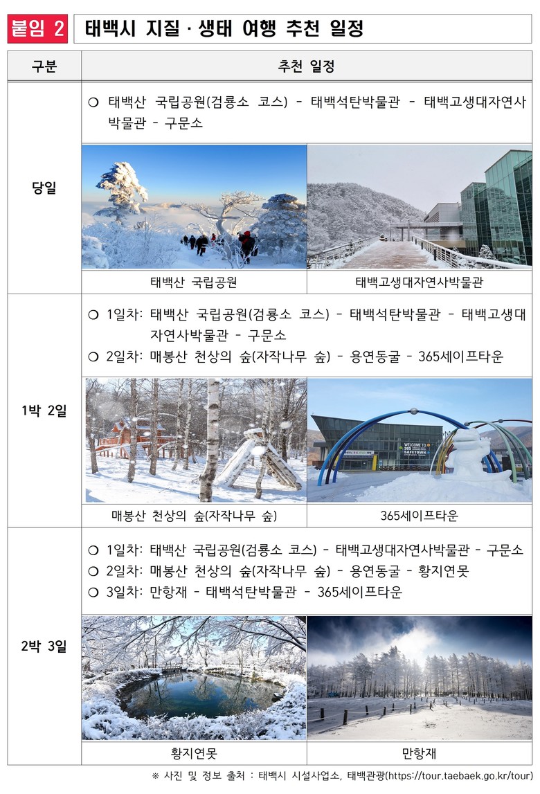 또한 1월 31일부터 태백산국립공원 일원에서 열리는 ‘제33회 태백산 눈축제’와 연계해, 겨울철 태백을 찾는 관광객들에게 자연·문화 체험의 폭을 넓혀줄 것으로 기대된다.