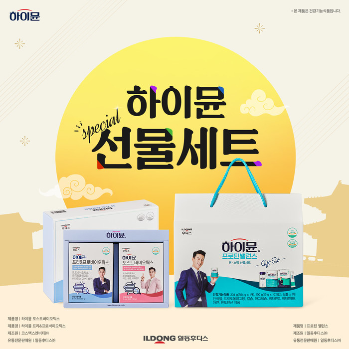 또한, 일동후디스는 추석을 맞아 ‘하이뮨 장 건강 프리미엄 선물세트’도 선보인다. ▲하이뮨 프리&프로바이오틱스 ▲하이뮨 포스트바이오틱스 총 2종을 한 세트로 구성했으며, 두 제품 모두 위산과 담즙으로부터 안전한 특허를 받은 4중코팅 유산균이 함유되어 있다. 모유 유래, 김치 유래 유산균도 부원료로 함유되어 있으며 네이버 스토어 팜, 하이뮨 몰 등 온라인 채널에서 구매 가능하다.