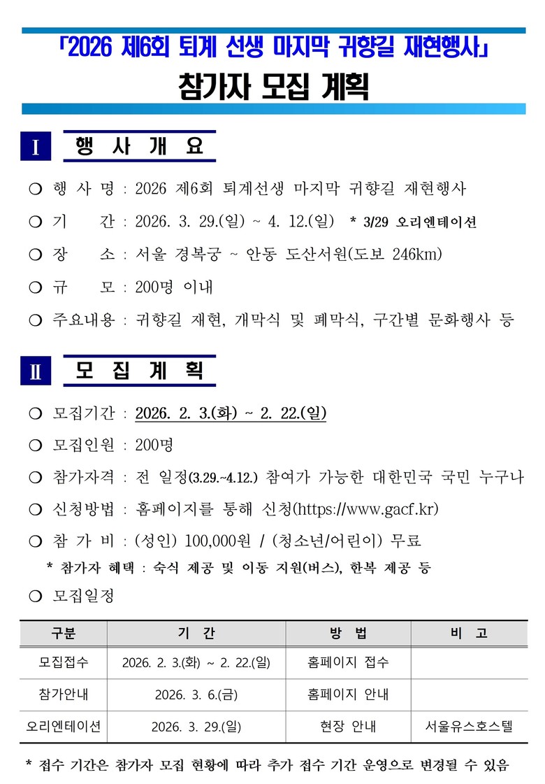 이번 행사는 총 200명 내외의 인원을 선발하고 역사와 인문학을 사랑하는 국민이라면 누구나 신청할 수 있다. 경북문화재단 공식 홈페이지를 통해 2026. 2. 3. ~ 2. 22.까지 온라인으로 접수하며, 참가비는 성인 10만 원, 청소년과 어린이는 무료이다.
