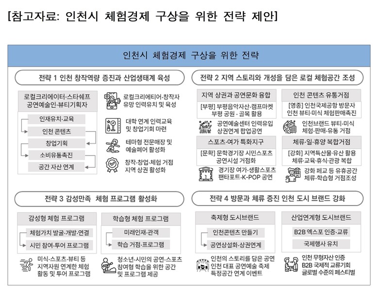이 연구는 인천의 역사・문화・경관・라이프스타일 등 지역 고유자산을 활용하여 양질의 체험을 제공하고 부가가치를 창출하는 체험기반 산업을 전략적으로 육성할 필요성을 제기하고 있다.