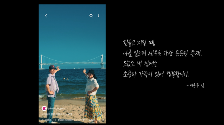경북 영양군에서 참여한 이수진 씨는 “부산에서 나고 자란 사촌 형제자매들이 연휴 때마다 그리운 부산에서 모이는데, 그 모습이 ‘부산이라 좋다’ 뮤직비디오에 등장해 가족 모두에게 소중한 추억이 될 것 같다”라며 뮤직비디오의 참가 의미를 높이 평가했다.