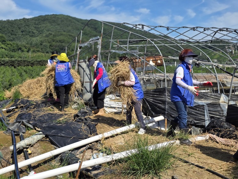이들은 장화,장갑,모자,갈아입을 옷등을 챙겨 창원시자원봉사자들과함께 버스를 탑승해 산청 수해복구현장으로 달려갔다. 이날은 튿히 그늘 한곳없는 뙤약볓에 산청군의 침수 피해 비닐하우스에 이집 저집으로 나뉘어 작업을 시작했다.