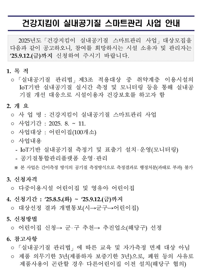 특히 영유아들이 머무는 어린이집의 특성을 고려해 더욱 세심한 실내 환경 관리를 나섰다. 지난 5월에는 관내 어린이집 50개소를 모집·선정했으며, 이번 8월부터 9월까지 100개소를 추가 모집할 예정이다. 신청을 희망하는 기관은 8월 5일부터 9월 12일까지 관할 군·구 환경 부서로 접수하면 된다.