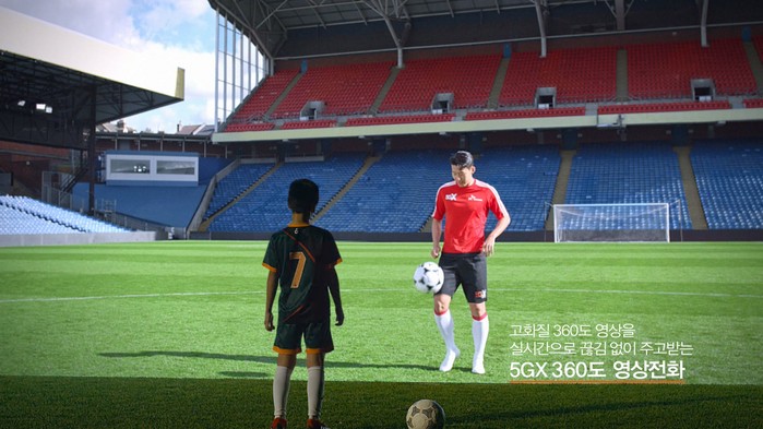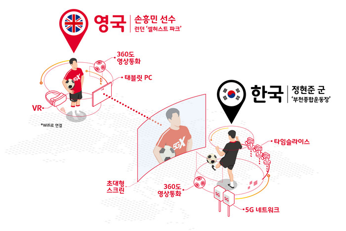 5G로 손흥민 선수 - 정현준 군 원격 연결 … 미디어 기술 활용해 개인 레슨 원격 축구 교실을 위해 정현준 군은 ‘부천종합운동장’에, 손흥민 선수는 영국 런던의 ‘셀허스트 파크’ 구장에 위치했다.