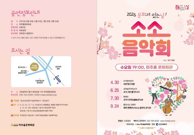 ‘소소 음악회’는 인천 시민 누구나 무료로 관람할 수 있으며, 자세한 내용은 미추홀문화회관 누리집(www.mchart.co.kr)에서 확인할 수 있다.