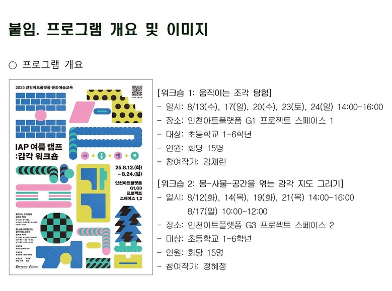 ○ 8월 12일부터 24일까지 초등학생 대상 무료 워크숍 진행 [인천 세계타임즈=심하린 기자] (재)인천문화재단-인천아트플랫폼은 오는 8월 12일(화)부터 8월 24일(일)까지 초등학생을 대상으로 감각 중심의 예술교육 프로그램 ‘IAP 여름 캠프: 감각 워크숍’을 운영한다. 본 프로그램은 예술가와의 협업을 통해 어린이들이 신체 감각을 탐색하고 창의적인 표현을 확장할 수 있도록 기획되었으며, 결과물은 전시로도 선보인다.