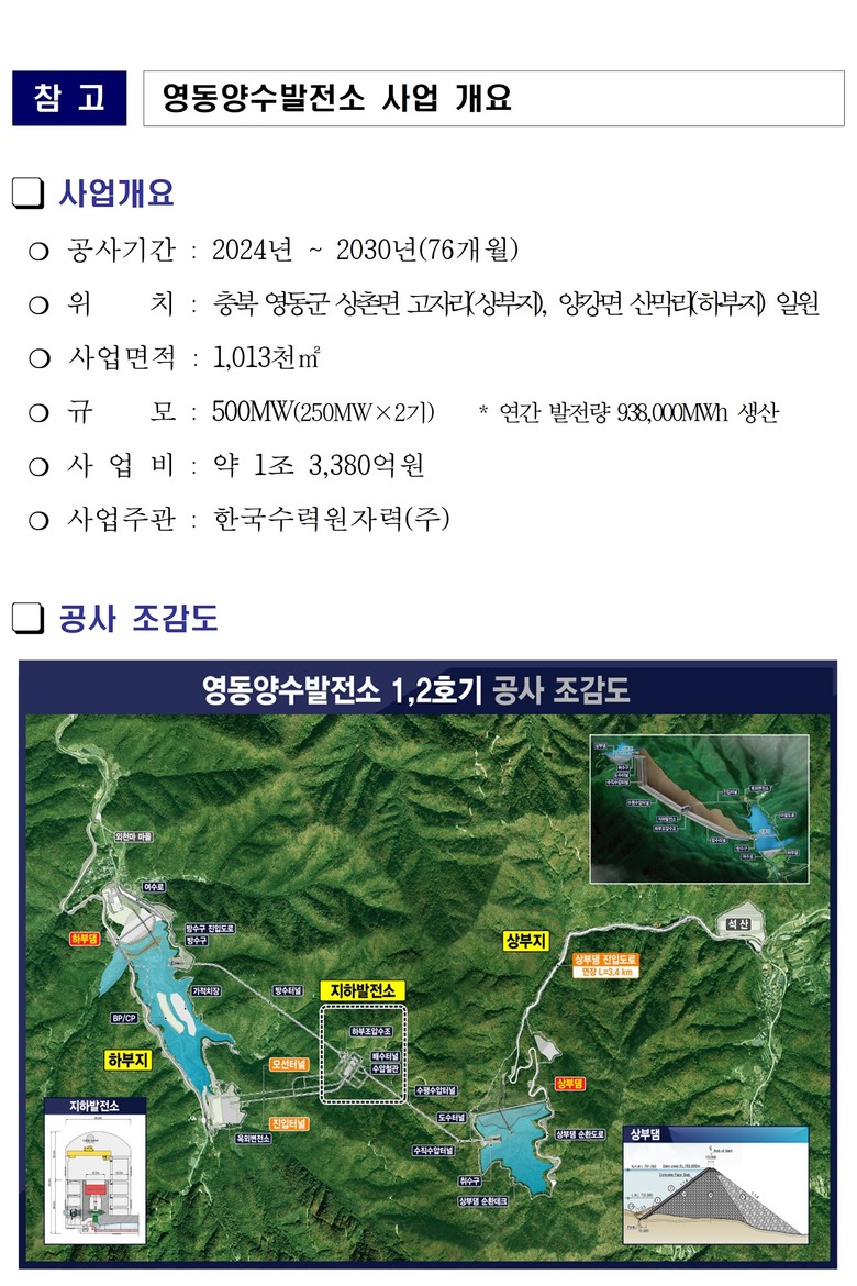 영동양수발전소는 충청북도 최초의 대규모 양수발전소로, 도 전력 자립률 제고는 물론 탄소중립 실현을 위한 남부권 친환경 에너지 생산 거점의 핵심 시설이다.