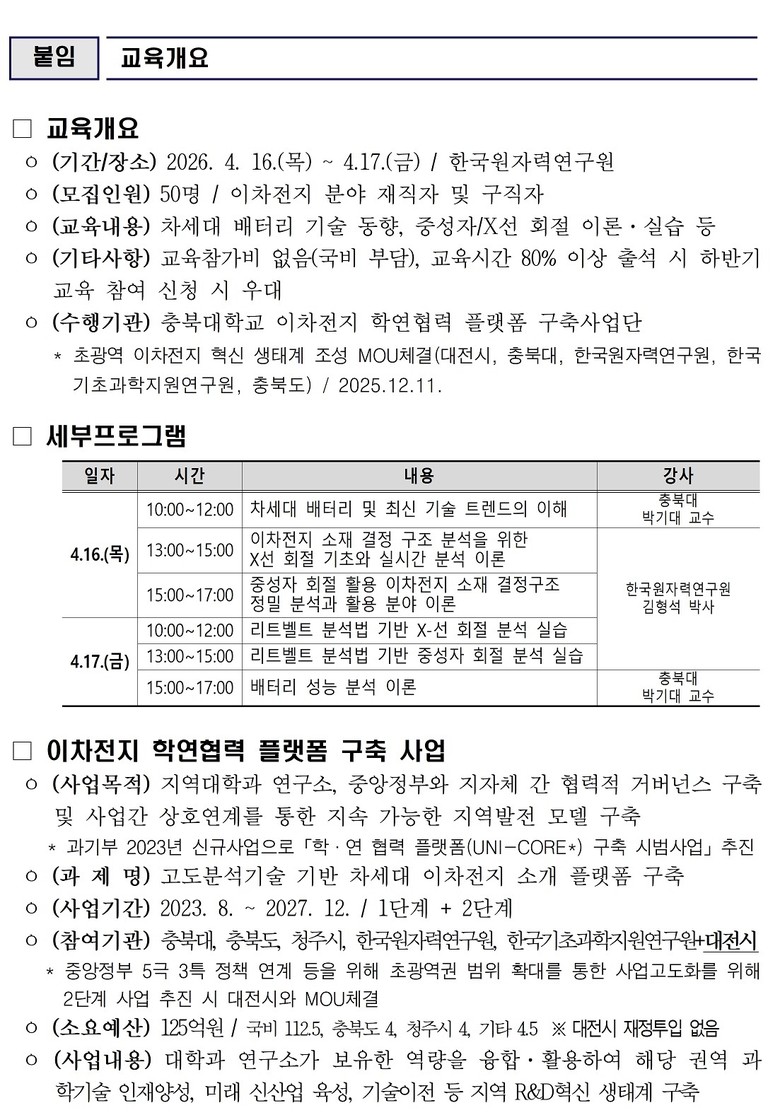 이번 교육과정은 기업 재직자와 구직자를 대상으로 차세대 배터리 기술 동향 이해와 중성자·X선 회절 기술을 활용한 이차전지 소재 분석에 대한 이론과 실습을 병행하는 단기 집중형 인력 양성 프로그램이다.