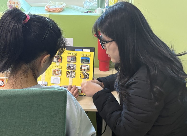 | ▲ 인천장애인종합복지관 긍정행동향상팀 강예진 사회복지사가 최중증 발달장애인 통합돌봄서비스 주간 개별형 지원사업 참여자와 그림을 보며 대화하고 있다. |