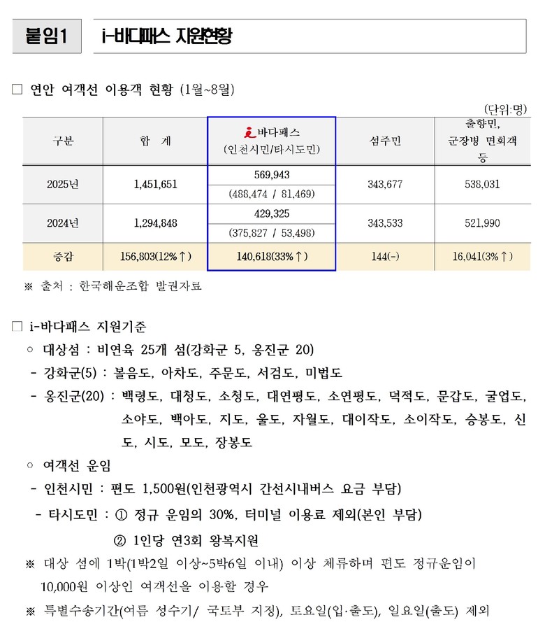 실제 이용객의 체감 반응도 긍정적이다. 백령도를 찾은 한 가족은 “교통비를 아낀 덕분에 현지에서 숙박과 먹거리, 체험을 더 풍성하게 즐길 수 있었다”며 i-바다패스 정책에 대한 만족감을 드러냈다. 교통비 절감이 곧 체류형 소비로 이어져 지역 경제를 살리는 선순환 구조가 만들어지고 있는 것이다.