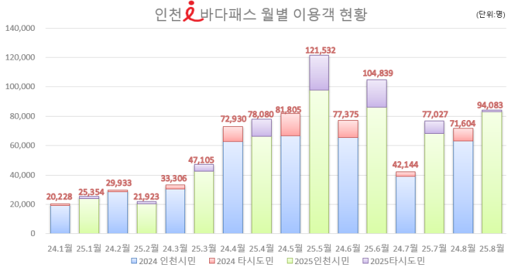 - 섬 지역 관광 매출도 전년대비 56억 원 껑충 - [인천 세계타임즈=심하린 기자] 인천시가 전국 최초로 도입한 i-바다패스가 단순한 교통 복지를 넘어 관광·경제 활성화의 혁신모델로 주목받고 있다. 8월까지 이용객이 전년 동월 대비 33% 이상 증가하며 ‘바다 위 대중교통’이 힘차게 순항 중임을 확인시켰다.