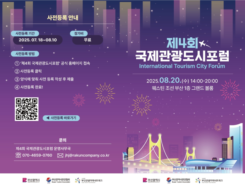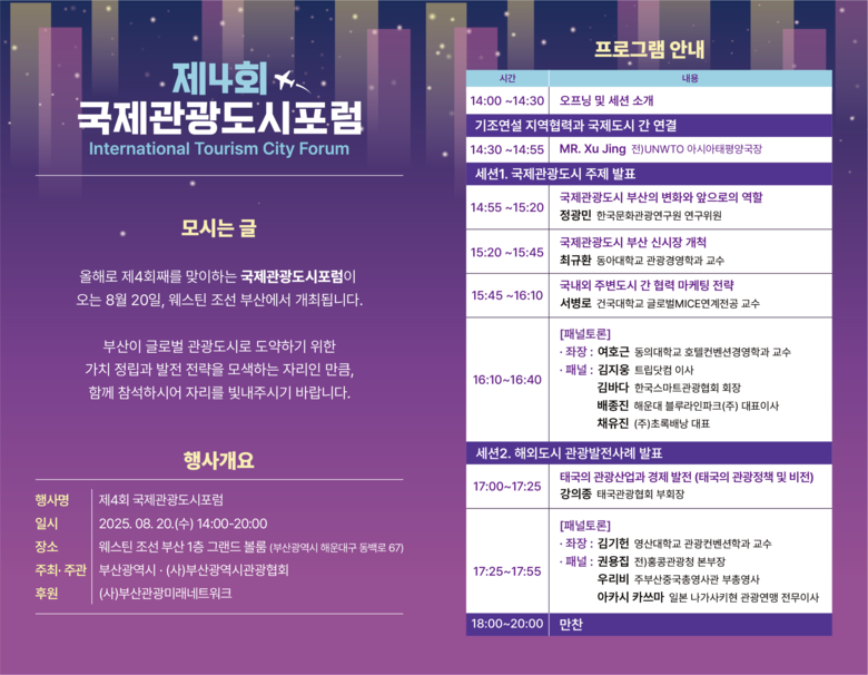 올해 4회째를 맞이하는 「국제관광도시 포럼」은 시가 주최하고 (사)부산관광협회가 주관한다. 시가 2020년 문화체육관광부의 공모사업으로 선정된 국제관광도시 육성사업의 하나로 2022년부터 개최해 왔다.
