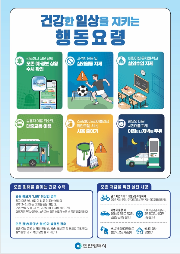 한편 시민들은 인천시 누리집을 통해 ‘오존예보 알림’과 ‘경보문자 알림’ 신청을 통해 알림톡과 문자를 받을 수 있으며, 오존 대응 행동요령을 안내받을 수 있다.