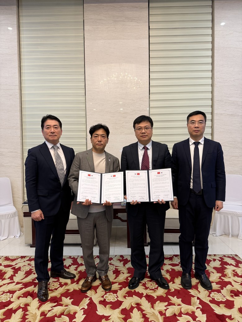 | ▲ 장민기 화성특례시 총괄정무 특별보좌관(왼쪽 두번째)과 린중린 샤오간시장이 협약서를 들고 있다 |
