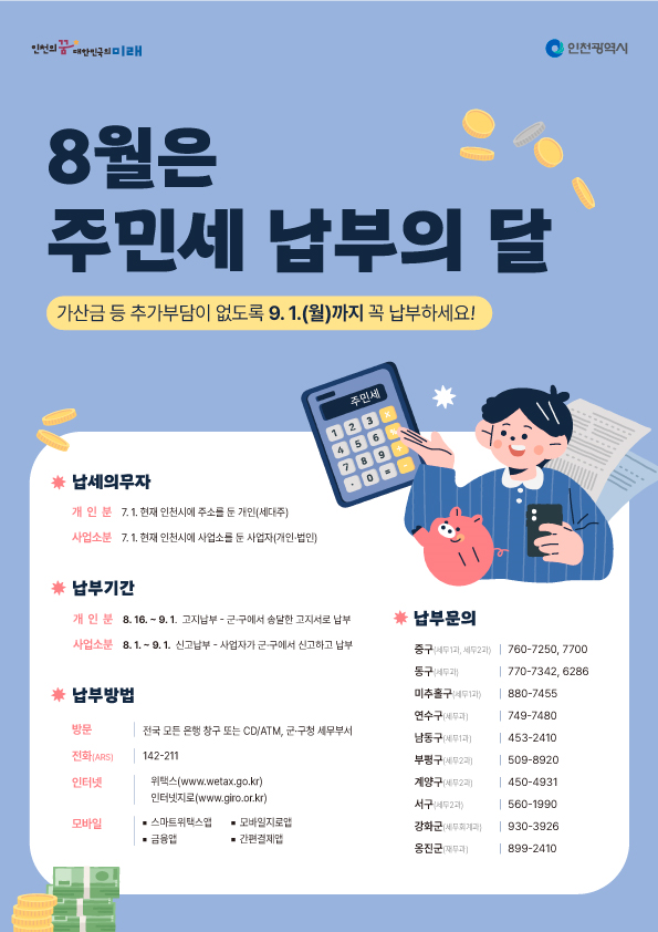 올해 7월 1일을 기준으로 인천시에 주소를 둔 세대주는 8월 16일부터 9월 1일까지 주민세 개인분을 납부해야 하고, 사업소를 둔 사업주는 8월 1일부터 9월 1일까지 주민세 사업소분을 신고·납부해야 한다.