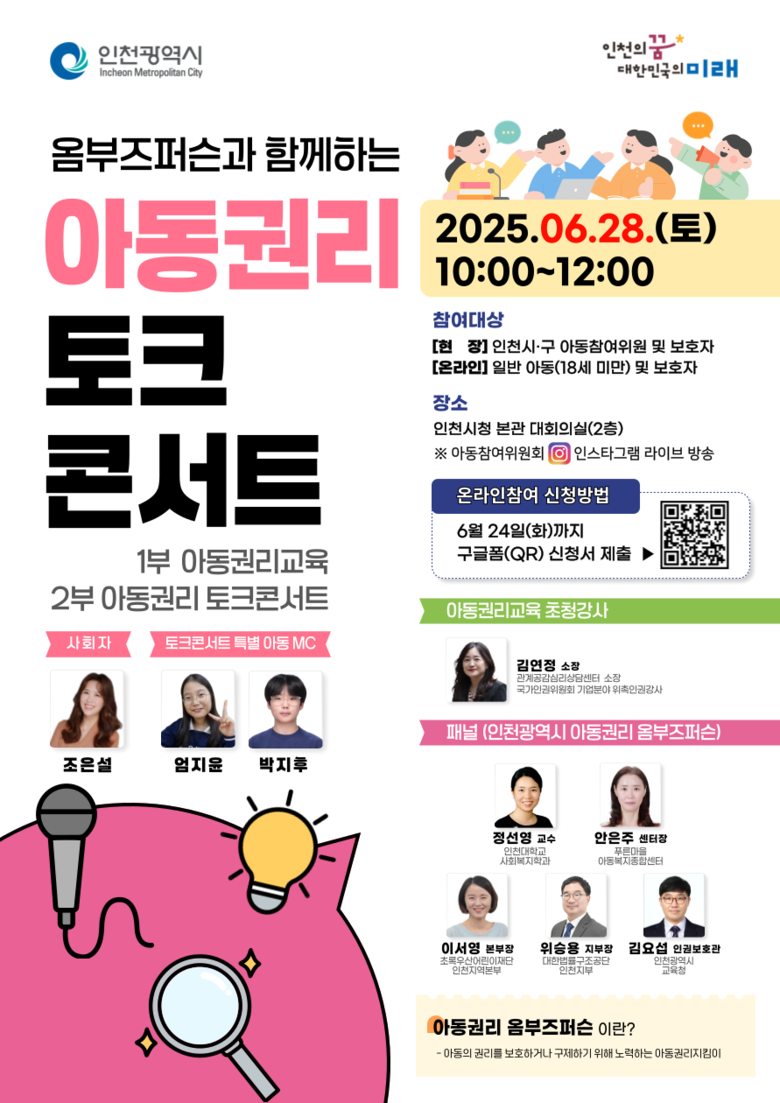 - 24일까지 인천시 누리집 통해 시민 누구나 온라인 사전 신청 가능 - [인천 세계타임즈=심하린 기자] 인천광역시(시장 유정복)는 아동의 권리 의식을 높이고 자유로운 의견 표현의 장을 마련하기 위해 6월 28일 인천시청 대회의실에서 ‘옴부즈퍼슨과 함께하는 아동권리 토크콘서트’를 개최한다고 밝혔다.