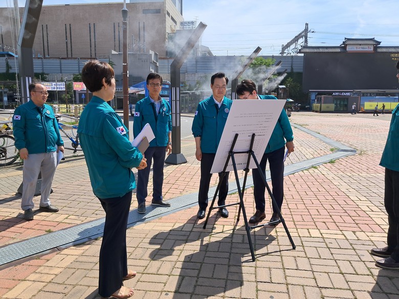 이어 동인천역 북광장에 설치된 폭염 저감 시설인 인공 안개 분사 장치, 즉 ‘쿨링포그’를 직접 체험하며 그 효과를 확인했다. 인공 안개 분사 장치는 주변 온도를 3~5도 가량 낮춰 더위를 효과적으로 식혀준다.