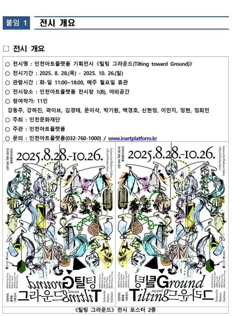 ○ 오는 8월 28일(목)부터 10월 26일(일)까지 전시장1(B)과 야외공간에서 진행 [인천 세계타임즈=심하린 기자] 인천문화재단 인천아트플랫폼은 기획전시 《틸팅 그라운드(Tilting toward Ground)》를 8월 28일(목)부터 10월 26일(일)까지 인천아트플랫폼 전시장1(B)과 야외공간에서 개최한다.