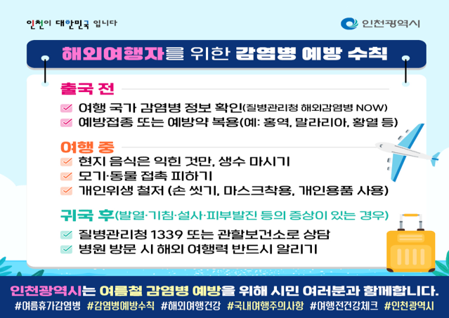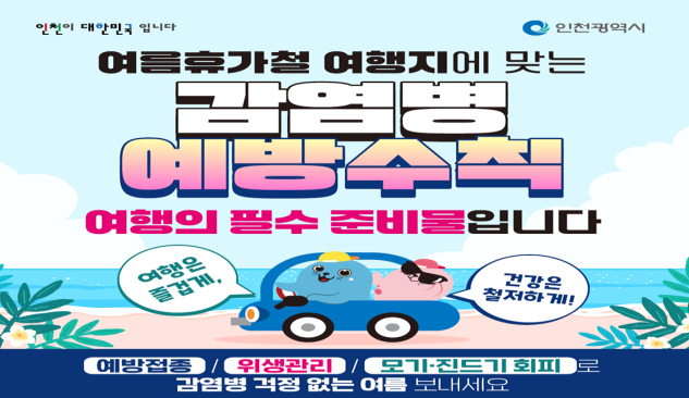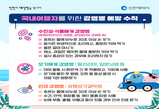 - 여행 전·중·후 감염병 주의… “손 씻기·모기 회피·개인위생 철저히”- [인천 세계타임즈=심하린 기자] 인천광역시(시장 유정복)는 본격적인 여름휴가철을 맞아 국내외 여행을 계획 중인 시민들에게 감염병 예방수칙 준수를 당부하며, 건강하고 안전한 여름 나기를 위한 홍보 활동을 강화하고 있다.