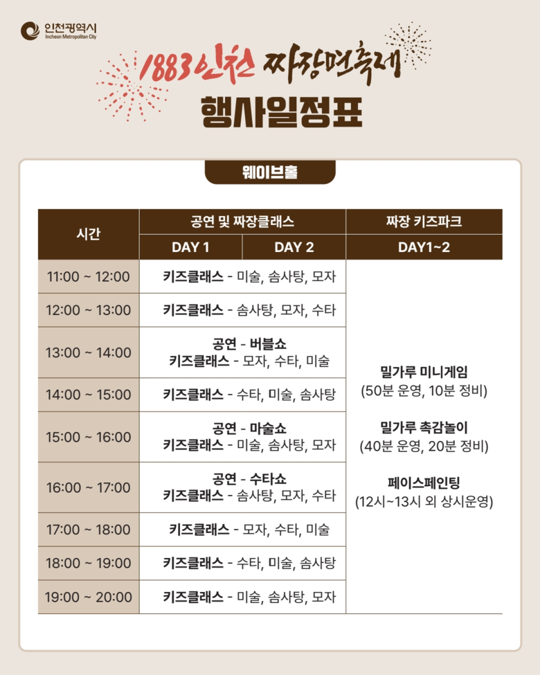 이외에도 어린이를 위한 키즈 클래스와 공연, DIY 짜장면 만들기 체험, 수타면 체험, 짜장면 독서존, 스탬프 투어, 거리 이벤트, 시식·시음 행사 등 남녀노소 누구나 즐길 수 있는 다채로운 프로그램이 준비되어 있다.